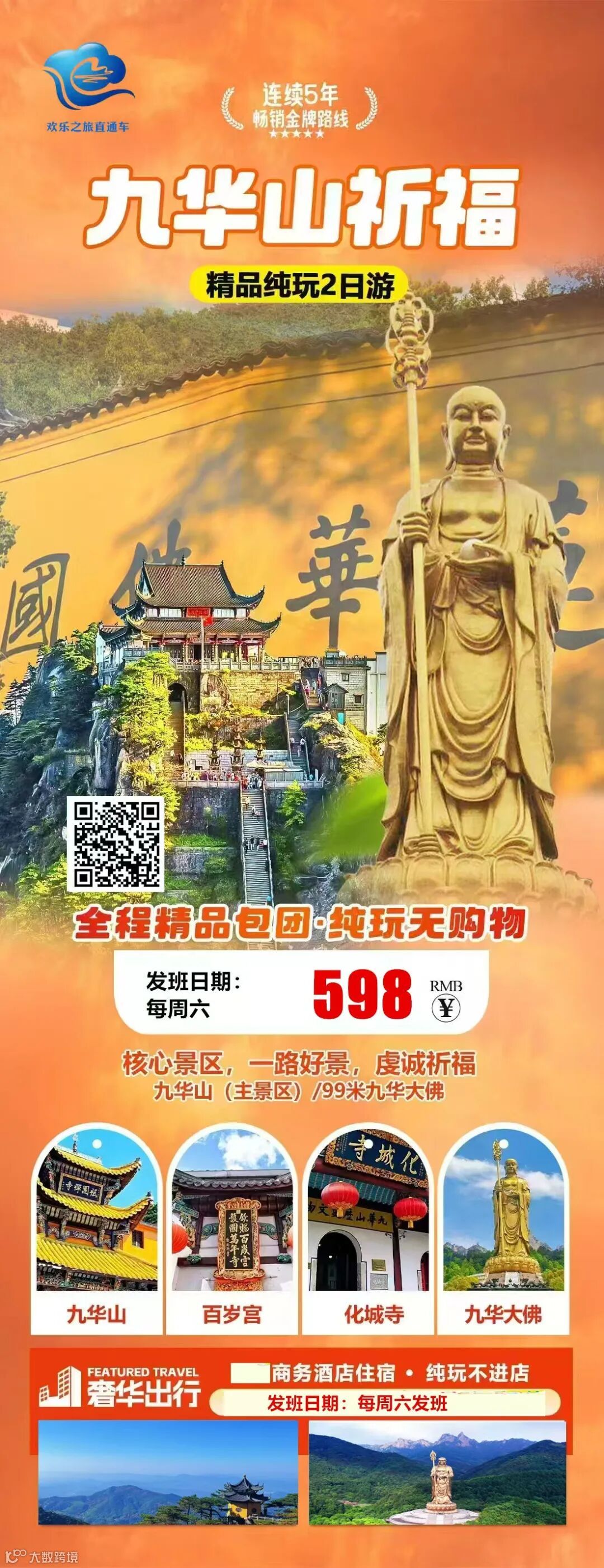 [福]九华山祈福、九华大佛和大愿文化园纯玩二日游 只要598