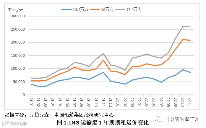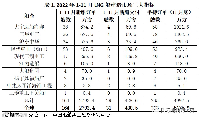 2022年LNG船建造市场船价上涨,订单飙升。1-11月,LNG船新船价格指数由159.04点提升至173.91点,累计增长9.4%。新船订单实现成倍增长,1-11月新船成交量共164艘、2793.4万立方米,分别是2021年全年的1.9倍和2.1倍,为历史最高成交水平。1-11月新船交付共31艘、430.4万立方米。11月底,全球LNG船手持订单共313艘、5175.9万立方米。新船订单主要由中韩两国船企承接,大宇造船海洋、三星重工、沪东中华、现代重工承接了全球90%以上的LNG船订单。以舱容计,1-11月新交付船舶中有90%以上来自韩国船企。新兴经济体天然气需求旺盛,推动全球天然气需求持续增加,能源变革叠加碳减排政策要求助推LNG海运量进入增量时代,展望2023年,预计LNG航运市场和建造市场热度依旧不减。