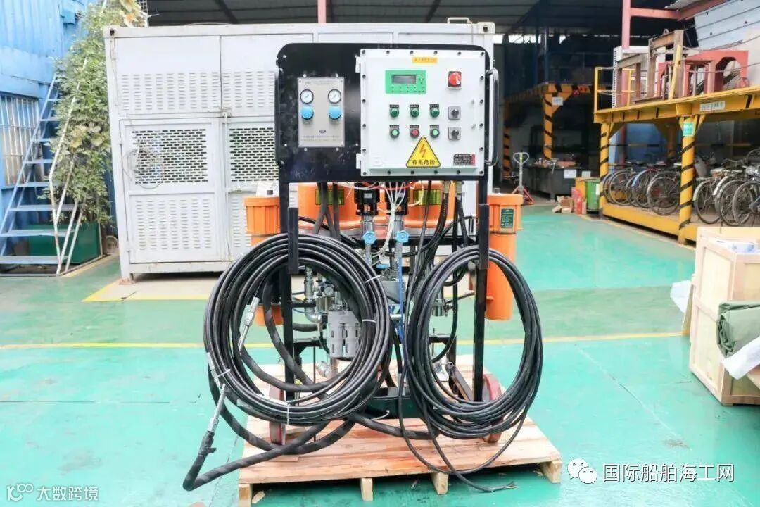 为了突破这一“卡脖子”关键核心技术,广船国际利用在涂装应用方面积累的经验优势赋能长江科技开展装备研制,经过长达2年的充分研究和试验论证后,成功突破技术封锁,掌握了从油漆灌装、运输、存储、配比、搅拌、喷涂到清洗的全流程技术,并在多型产品船分段涂装中成功应用。按照国内船舶行业此前常用的“20升+5升”组合的双组份涂料计算,每建造一艘万吨级船舶,应用大包装双组分喷涂技术,可减少2万至4万个空油漆桶。