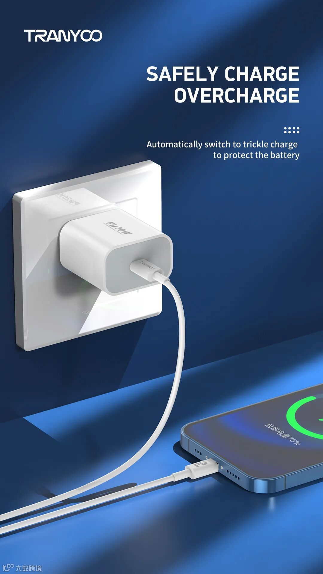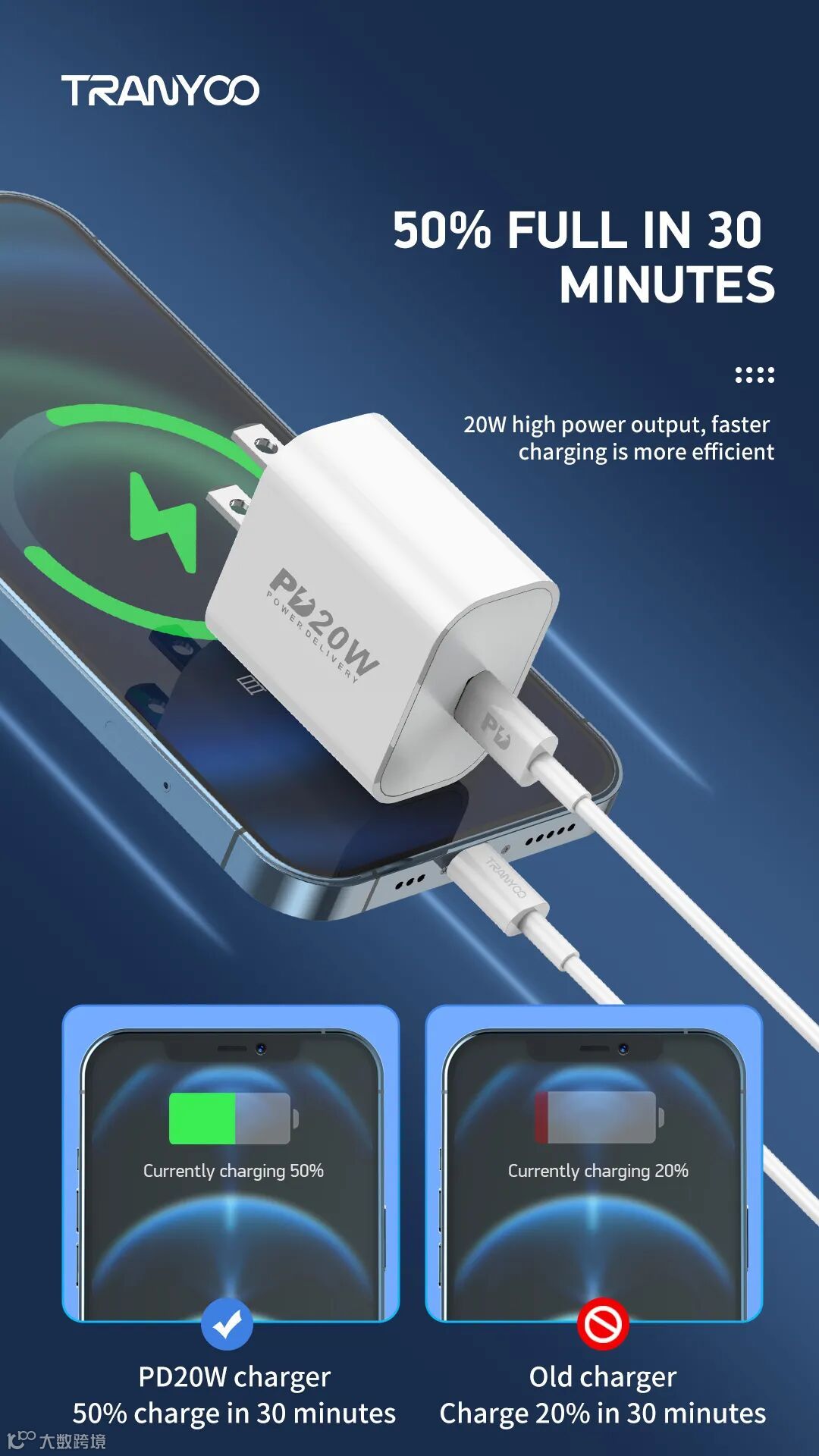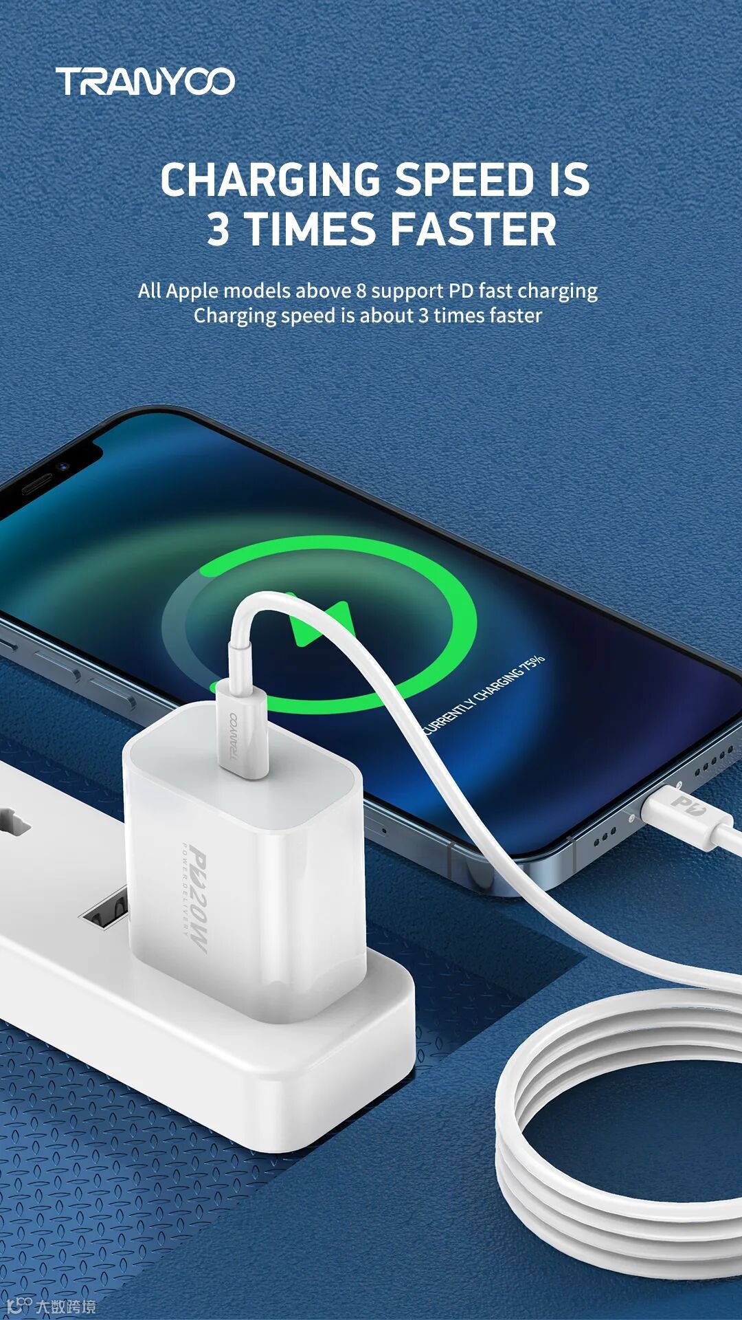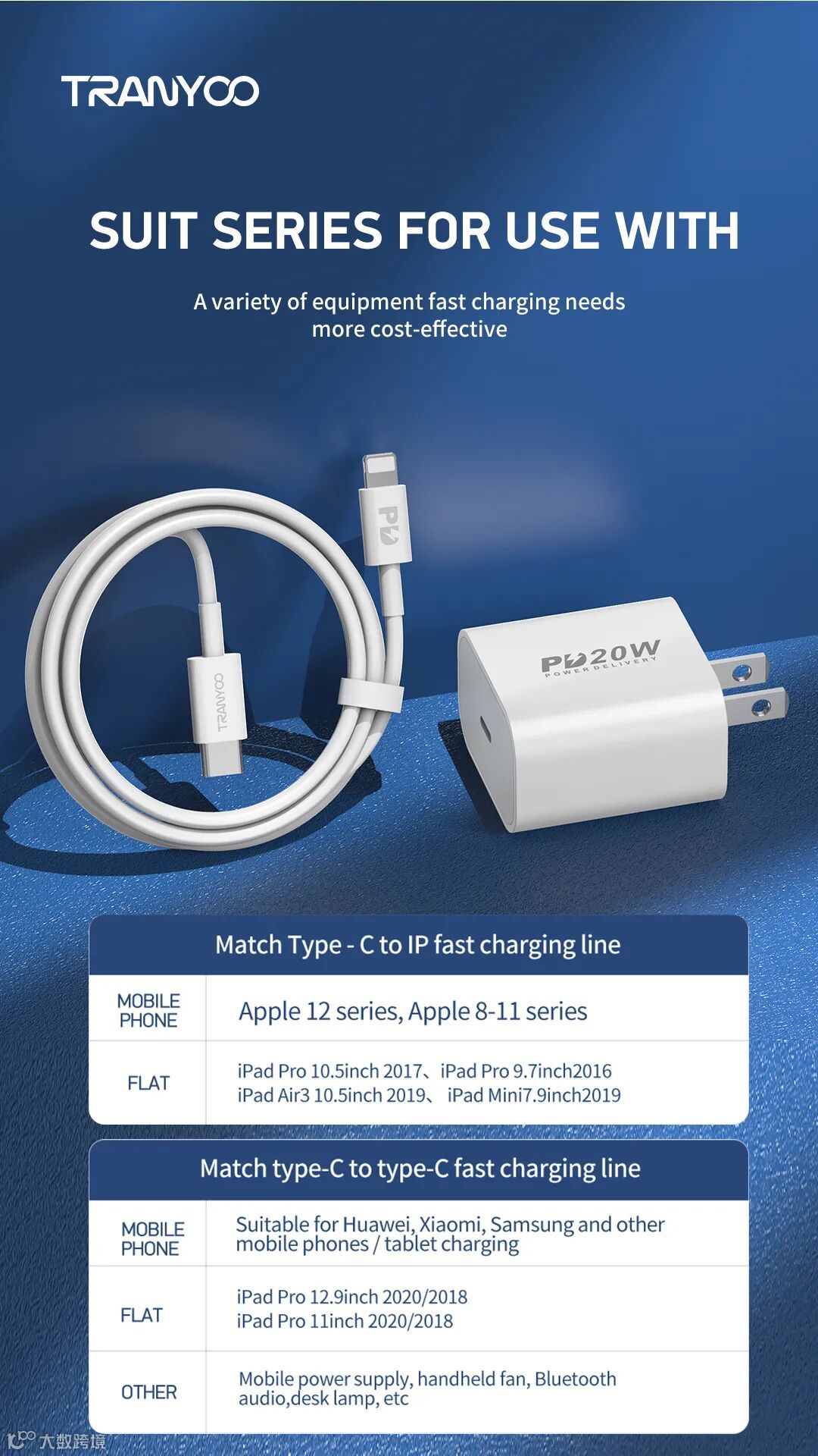 1.PD20W quick charging head is matched with one-meter quick charging wire.