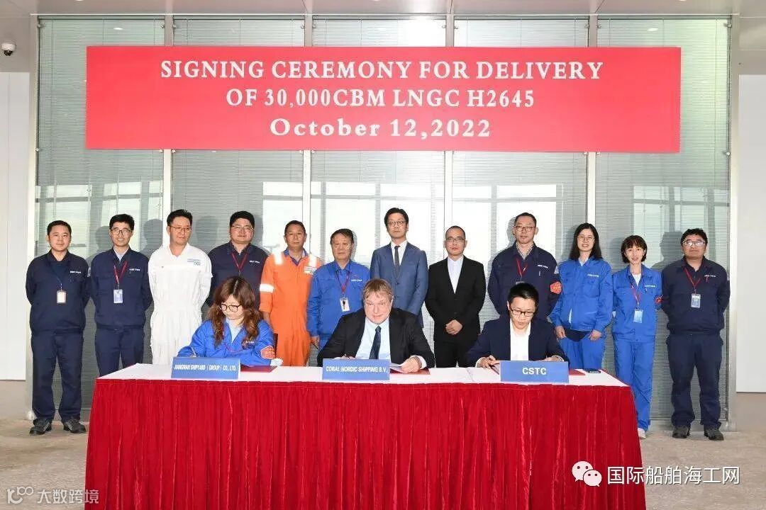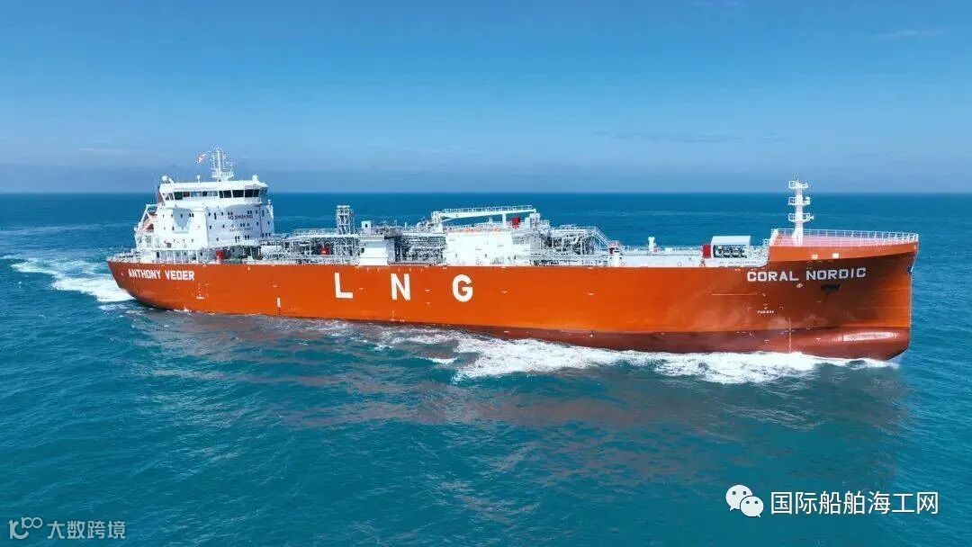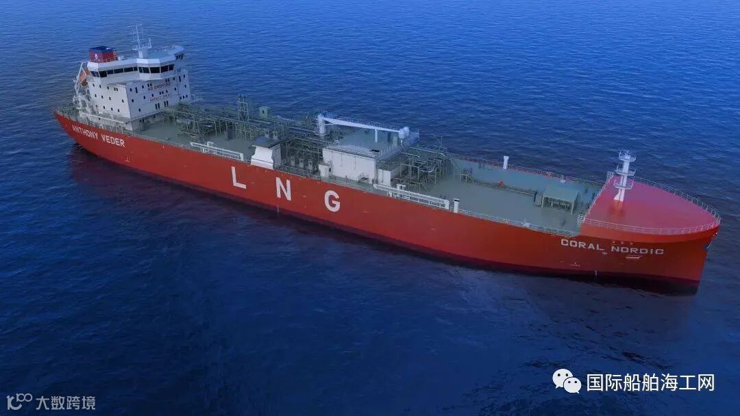 10月12日,中国船舶集团有限公司旗下江南造船(集团)有限责任公司为荷兰船东Anthony Veder公司设计、建造的30000立方米液化天然气(LNG)运输船“Coral Nordic”号在上海签字交付。“Coral Nordic”号总长176.8米,型宽28.8米,型深19米,入级DNV船级社,配备双燃料主机、双燃料发电机和双燃料热油锅炉,满足最新排放要求及冰区1A要求,采用全船低温防寒设计,可在北欧运行。