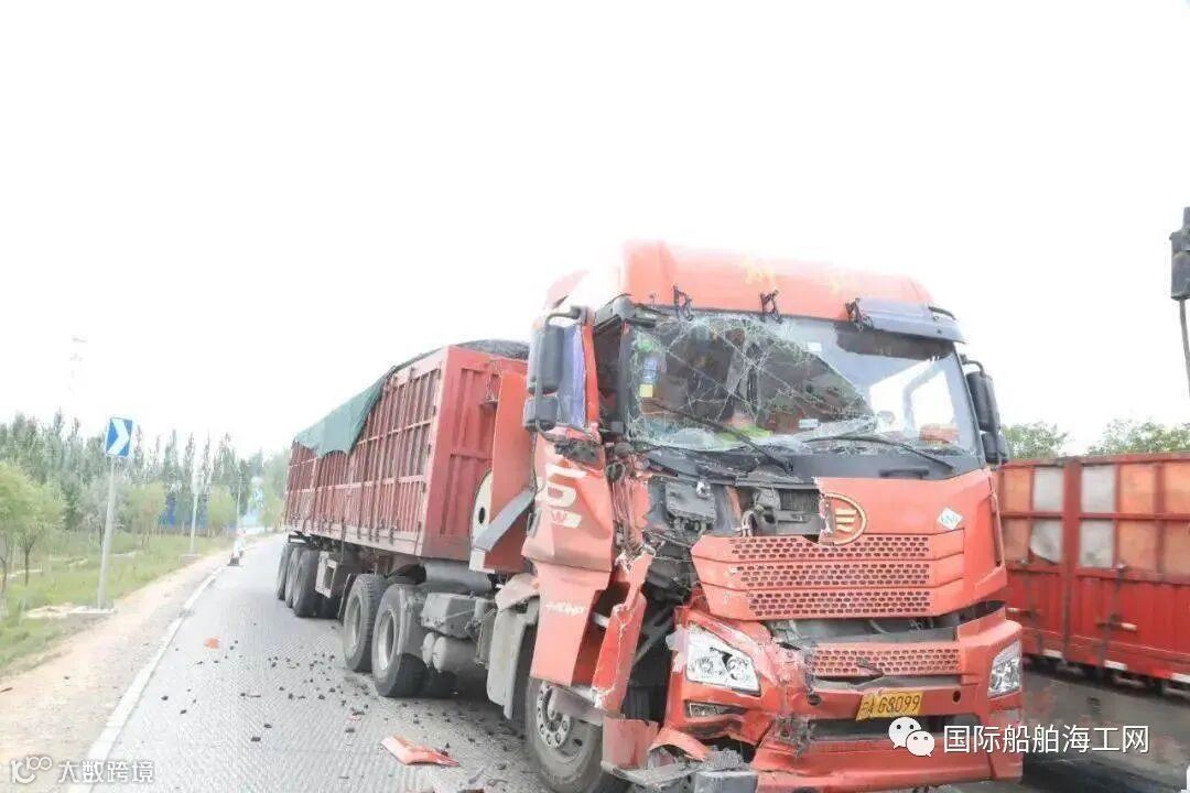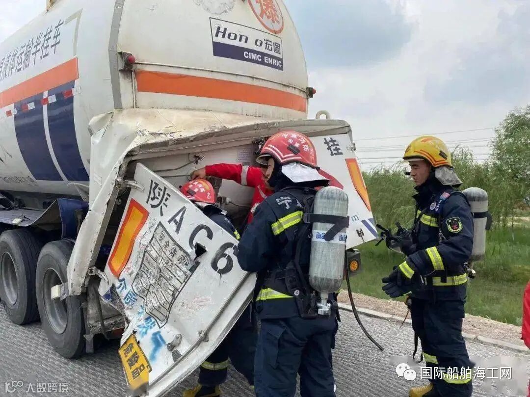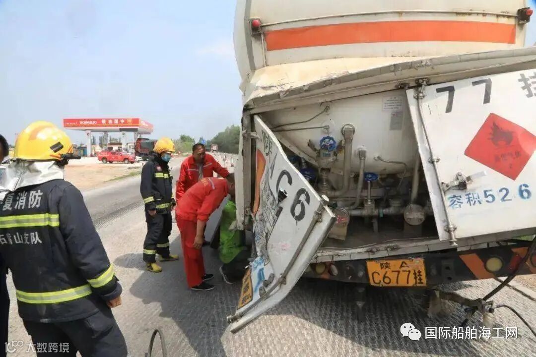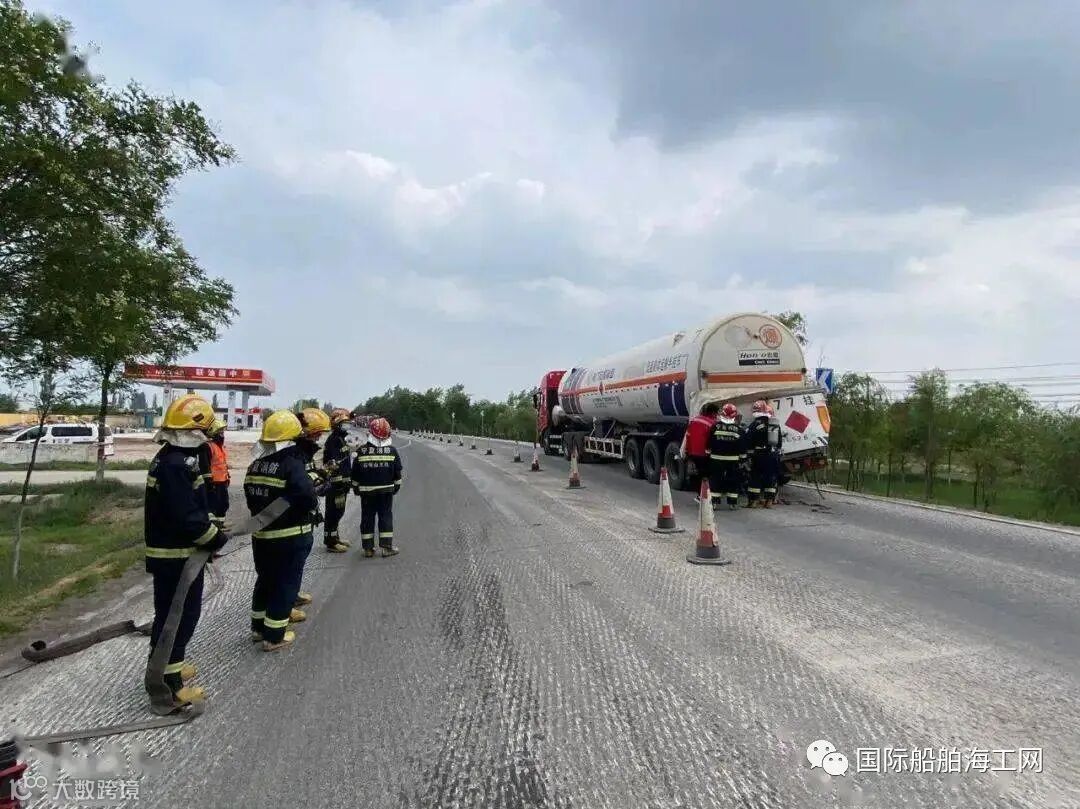 由于事发地点距离最近的消防站有近30公里的路程,出警途中,通信员与报警人取得联系了解具体情况,得知:报警人为天然气罐车的驾驶员,事故中无人员被困,但是天然气罐车内载有22.5吨LNG液化天然气,被后方一辆载煤的卡车追尾,驾驶员下车查看后发现,位于车尾的操作箱门已被撞变形无法打开,但能很清晰的听到里面传来阵阵响声,疑似泄漏,但无法判断罐泄漏的量有多大,随即向119与110都打了电话报警求助。