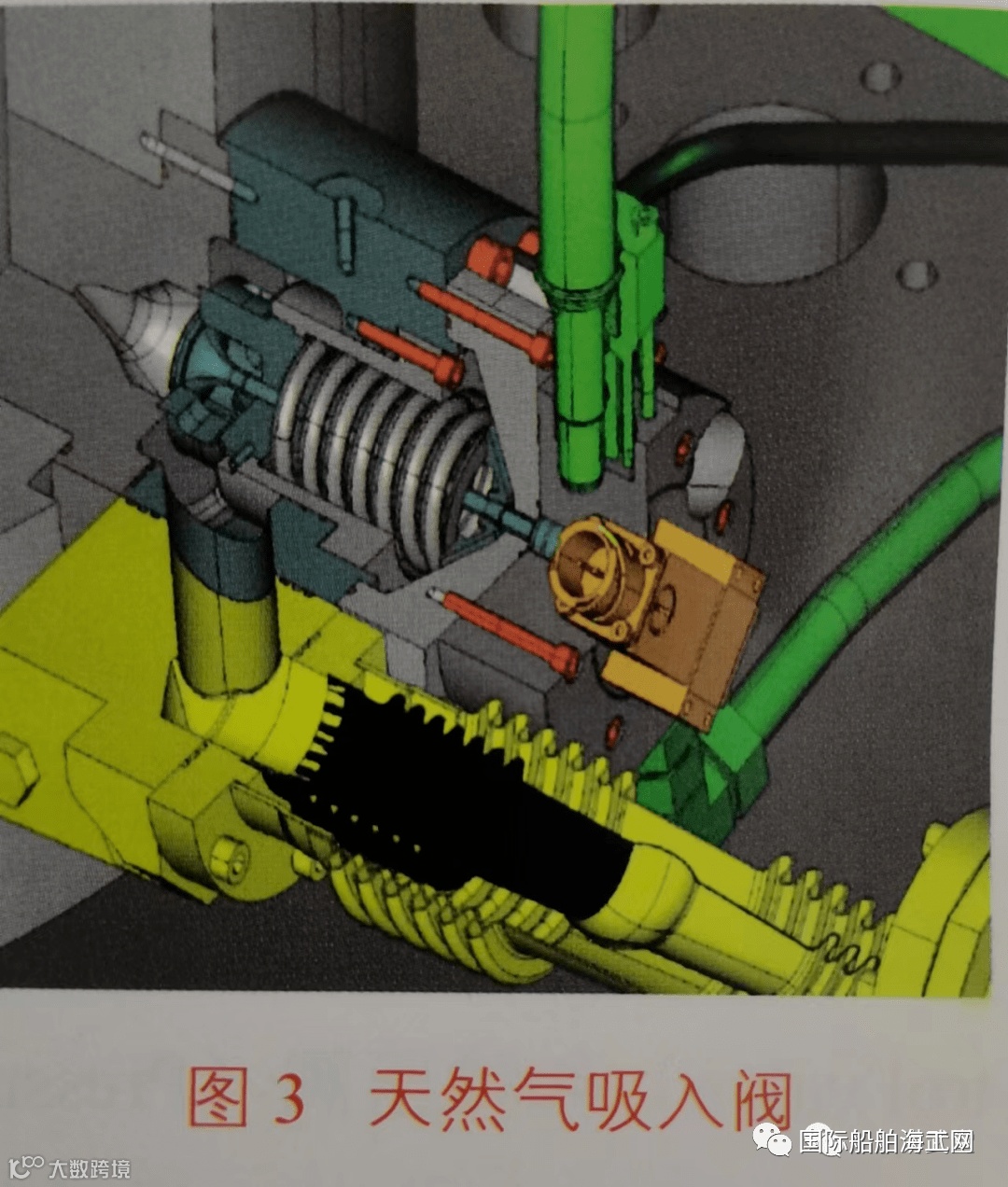 3.每个气缸上装有两个天然气吸入阀(见图3)控制天然气注入到气缸中,当吸入阀打开时,天然气喷入气缸中。ECS通过控制天然气吸入量调节发动机的负荷。伺服油是用来控制天然气吸入阀动作的,安装在缸头上的吸入阀冲程传感器信号传送到ECS,ECS根据接收到的信号及发动机的负荷调节天然气供给定时。当天然气吸入阀的电磁阀失电时,弹簧压缩,吸入阀关闭。天然气吸入阀是单壁结构的,出于安全考虑,