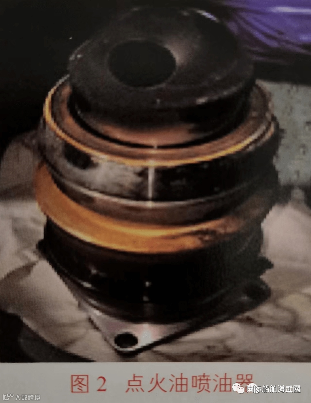 点火油从MDO日用油柜经过供给泵、点火油冷却器(旁通)、点火油自清滤器进入发动机本体。机上点火油系统包括进机双联滤器、点火油泵、高压管路、点火油喷油器(见图2)、泄漏收集器和泄漏管。为了避免HFO污染MDO油柜而影响点火油系统,船上最好设有专用的点火油柜。