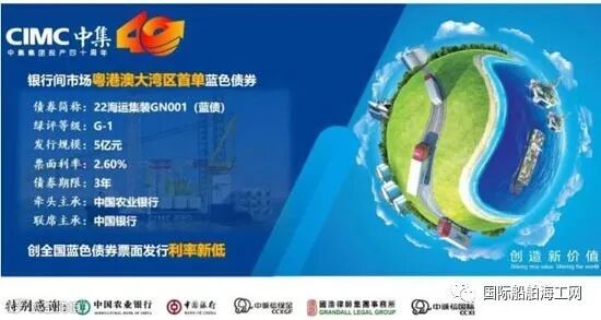该笔蓝色债券由中集集团财务管理部牵头,统筹安排评估机构、律所、金融机构,合力筛选出契合中集战略导向的绿色项目,成功获得银行间交易商协会创新部蓝色债券认定,并由中集战略合作银行中国农业银行与中国银行成功发行。该笔债券为银行间市场粤港澳大湾区首单蓝色债券,创全国蓝色债券票面发行利率新低,并创中集集团在公开市场发行中长期债券利率的新低。