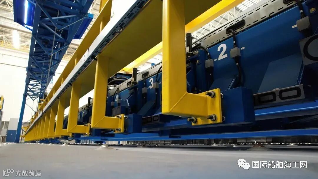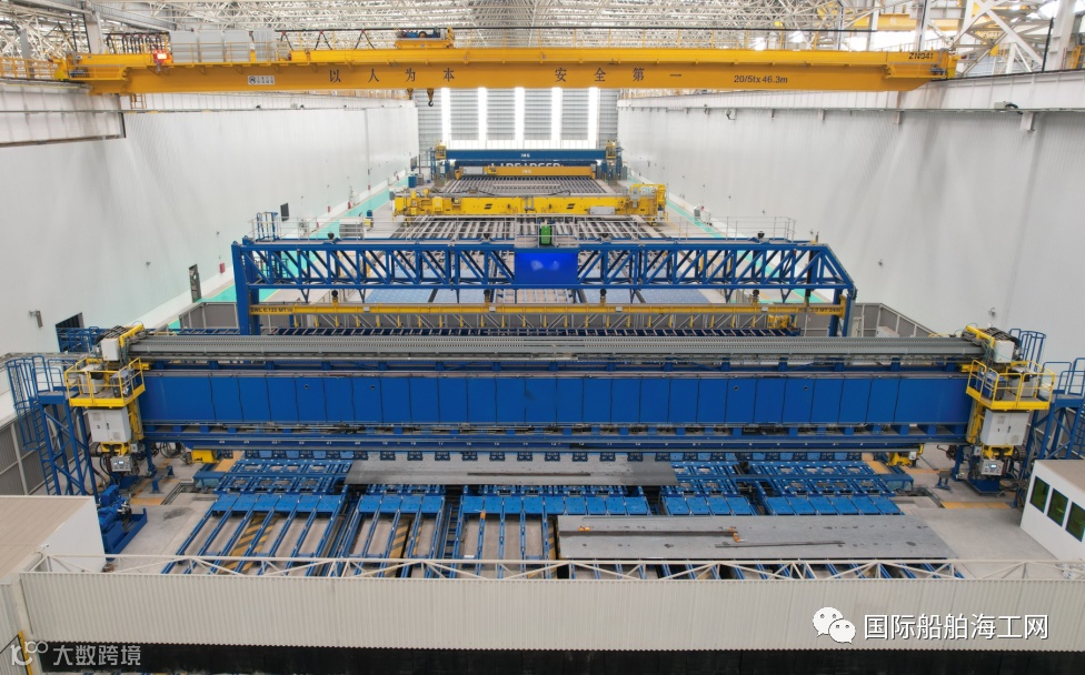激光焊接薄板生产流水线作为海门基地智能制造的核心,最大处理尺寸24mX36m,从钢板上料、铣边、拼板焊接、划线焊缝打磨、纵骨装焊全部实现自动化控制,采用高速光纤激光复合焊完成板件拼接及纵骨角焊缝焊接,同时具备船长及船宽方向不同厚度板片拼板,能满足大、中、小全类型豪华邮轮的建造,上线率可达90%以上,拥有极大的适应性;整条流水线采用U型布局设计,通过MES系统集成,兼顾流水线作业效率及造船离散型作业柔性,实现薄板分段高效智能制造。