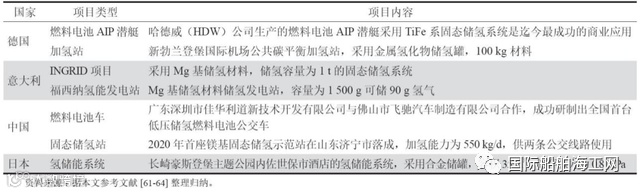 固态金属氢化物储运氢是利用储氢合金在一定温度和压力条件下的可逆吸/放氢反应来实现氢气储运的。氢在储氢合金表面分解为氢原子,扩散进入合金内部与其发生反应生成金属氢化物,氢即以原子态储存在金属内的四面体与八面体间隙位置。金属氢化物具有储氢体积密度大、安全、氢气纯度高、操作容易、运输方便、成本较低等优势。固态金属储氢的商业应用主要为潜艇、核电站、发电站、加氢站、便携式测试设备等(表3),如德国GKNHydrogen公司有10~265kg不同型号的固态储氢系统,可低压运行并100%可回收,无容量损失(材料消耗)等优势;美国ECDOvonic公司采用轻质碳纤维包卷形成的储氢罐,所含的金属氢化物可储存约3kg的氢气;丰田公司的氢动力汽车均采用了ECDOvonic公司的技术。目前,国内金属氢化物储氢应用还较少,正处于研发与示范阶段,提高金属氢化物的储氢量、降低材料成本、提高金属氢化物的可循环性等将是未来的研究重点。