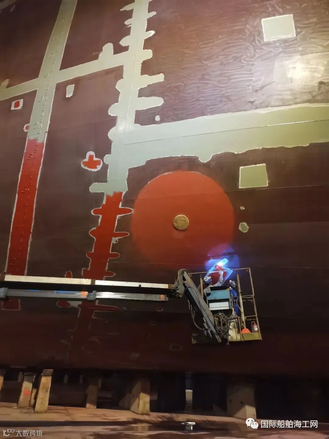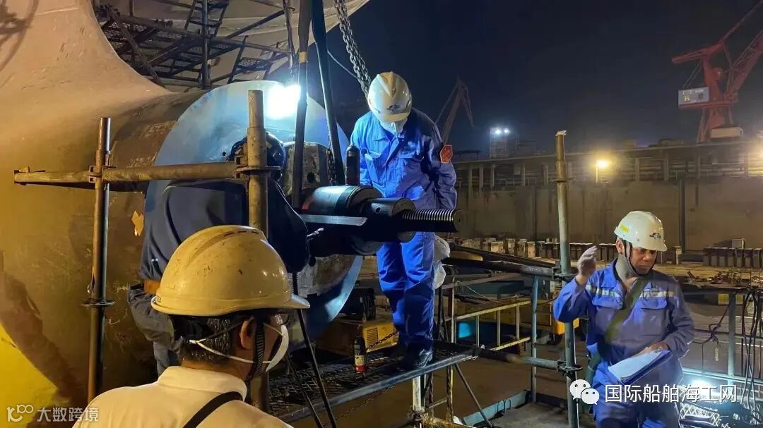 水下工程施工是决定出坞周期的关键因素之一。总装部机装课水下工程团队以缩短机舱艉岛成型至水下工程施工周期为目标,通过精益管理和工艺攻关,开展了一系列工序前移工作,目前已在总组阶段实现了舵机座、中间轴承等大型座架的定位和装焊作业,以及地面轴舵系预镗孔。以张辉、高登、沈鑫、李永杰为代表的工艺人员持续开展研究,不断减少预留镗孔余量,为缩短坞期奠定了坚实基础。