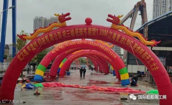 3月22日上午,由武汉创新江海运输有限公司和武穴市开阳星造船公司联合建造的三峡低碳节能型130M江海直达LNG动力双燃料船举行开工庆典。