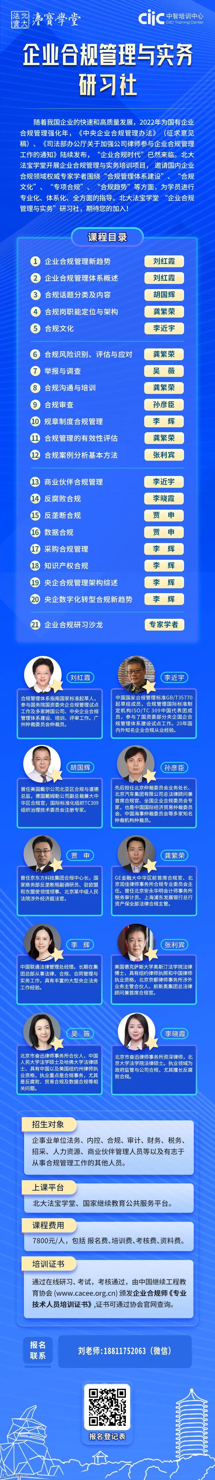 中智培训中心联合北大法宝学堂开展企业合规管理与实务培训项目,邀请国内企业合规领域权威专家学者围绕“合规管理体系建设”、“合规文化”、“专项合规”、“合规趋势”等方面,为学员进行专业化、体系化、全方面的指导。企业合规管理与实务”研习社,期待您的加入!