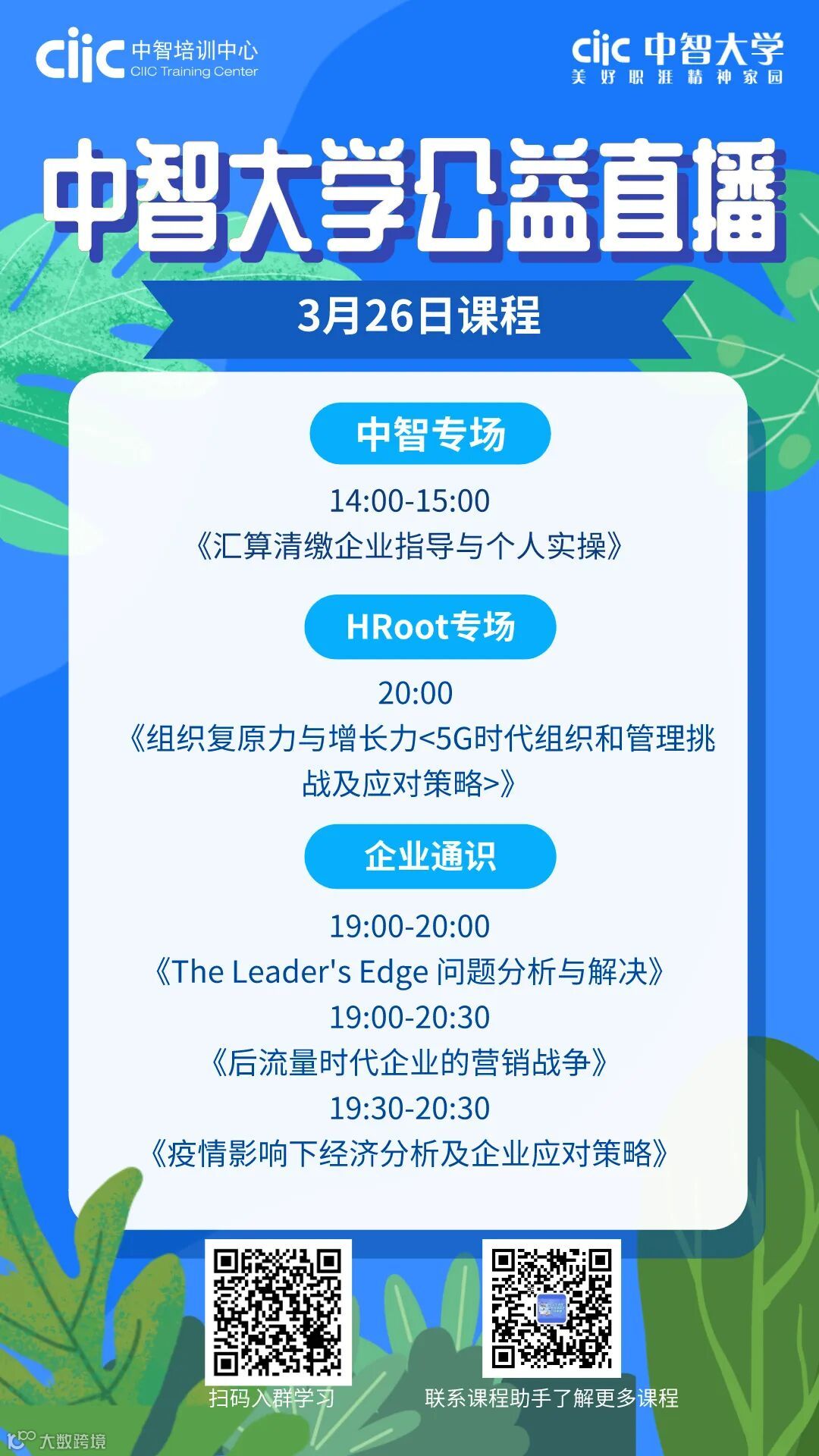 各位爱学习的小伙伴~中智公益直播课堂3月26日的课程预告来了