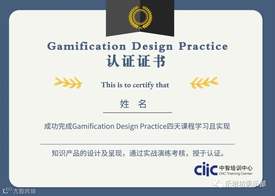 **成功完成Gamification Design Practice(Phase1和Phase2)四天课程学习且实现一个知识产品的设计和呈现,通过实战演练考核的学员,将获得【中国国际技术智力合作公司培训中心】授予的Gamification Design Practice认证证书。