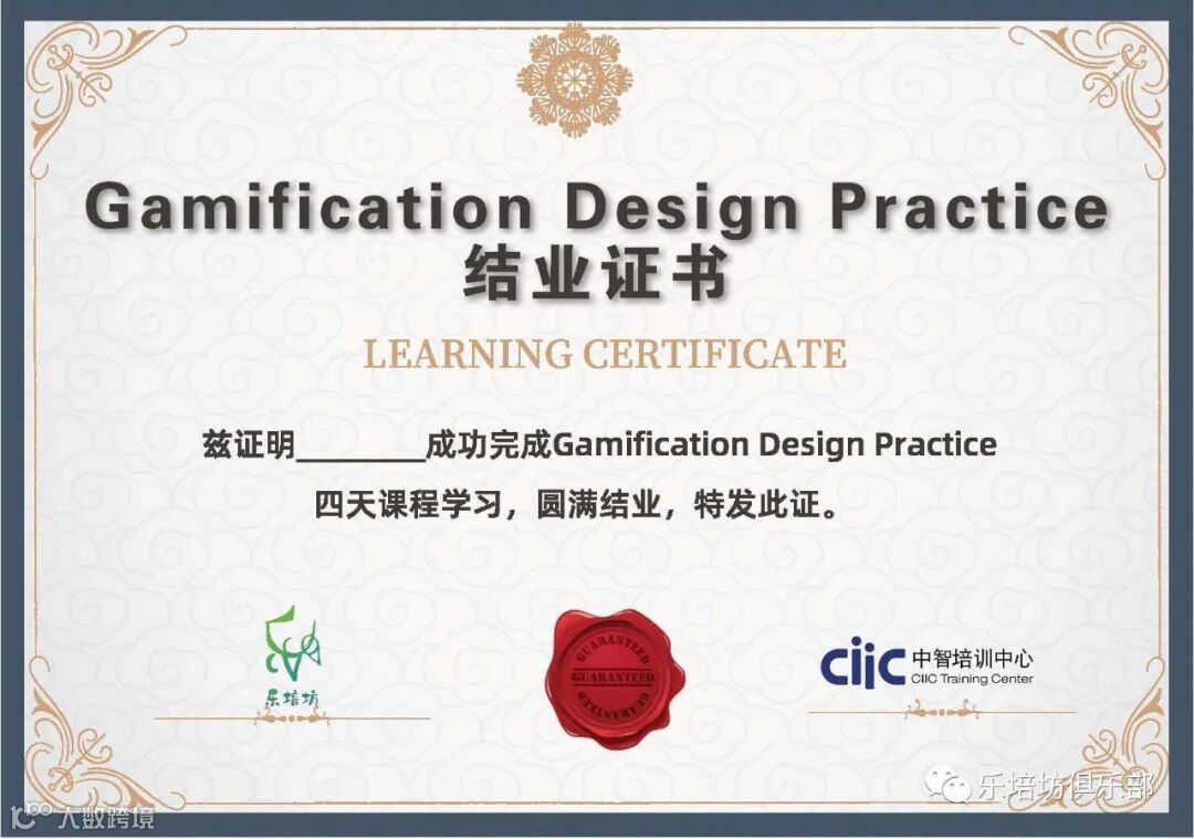 **完整参加Gamification Design Practice(Phase1和Phase2)四天课程的学员,将获得【中国国际技术智力合作公司培训中心】与【乐培坊】联合颁发的Gamification Design Practice结业证书。