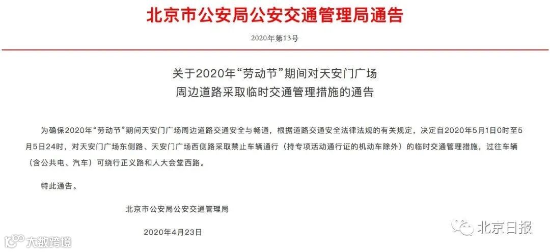 自2020年5月1日0时至5月5日24时,对天安门广场东侧路、天安门广场西侧路采取禁止车辆通行(持专项活动通行证的机动车除外)的临时交通管理措施,过往车辆(含公共电、汽车)可绕行正义路和人大会堂西路。