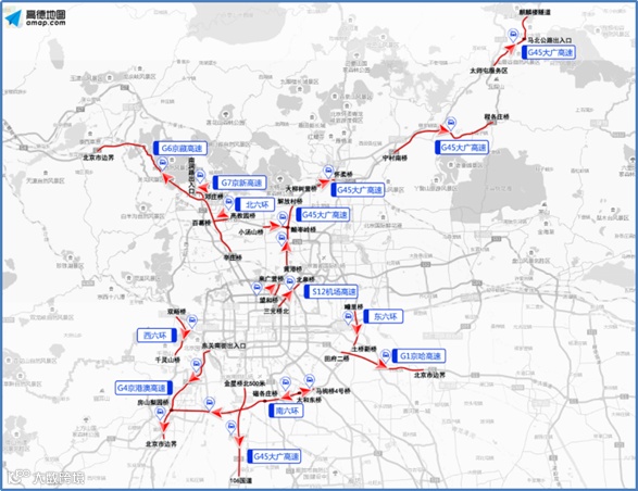 5月3日至5日下午14至18时,进京方向的交通压力将明显上升,其中京藏高速康庄、居庸关、西三旗、北沙滩,京承高速黄港、太阳宫,京港澳高速琉璃河、西道口,京开高速玉泉营、新发地、榆垡等路段车流较为集中。