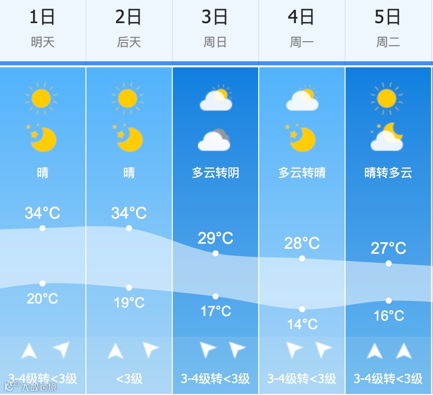 1日~2日天气晴热,最高气温34℃,小伙伴们短袖和小裙子准备穿起来啦;3日夜间有小雨淅沥沥;4日~5日雨过天晴气温降,昼夜温差大,记得调整着装哦!