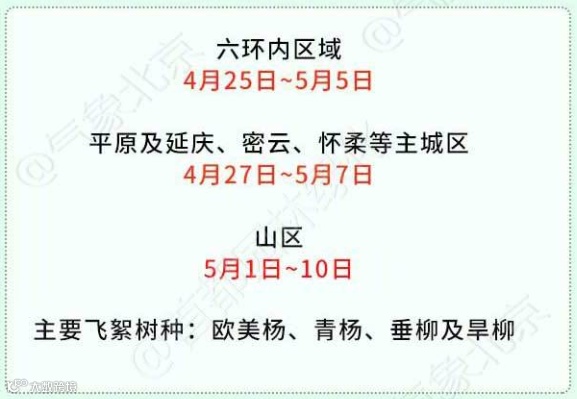 六环内区域:4月25日-5月5日;平原及延庆、密云、怀柔等主城区:4月27日-5月7日;山区:5月1日-10日。