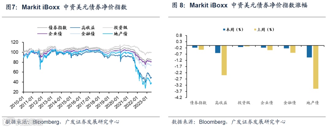 本周(2023.6.26-6.27)大类资产:权益>债券>商品。上周大类资产:美元>债券>权益。本周(2023.6.26-6.27)全球权益资产表现分化,港股表现突出。上周全球权益资产普跌,港股表现落后。本周(2023.6.26-6.27)大宗商品普跌,天然气>金属>农产品。上周大宗商品普跌,天然气>化工品>金属。本周(2023.6.26-6.27)美元指数小幅下跌,主要国家货币相对美元升值。上上周美元指数小幅上涨,主要国家货币相对美元贬值。本周(2023.6.26-6.27)美债长短端利率有所上行。上周美债短端利率基本持平,长端利率有所下行。本周(2023.6.26-6.27)Markit iBoxx中资美元债券净价指数下跌,细分项普遍下跌。