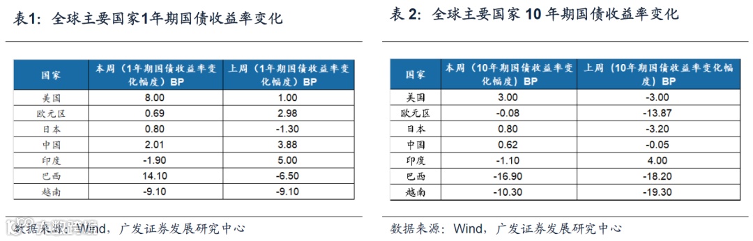 (2)上周美债短端利率基本持平,长端利率有所下行。1年期国债收益率中,美国(升1.00BP)、欧元区(升2.98BP)、中国(升3.88BP)、印度(升5.00BP)上行;日本(降1.30BP)、巴西(降6.50BP)、越南(降9.10BP)下行。10年期国债收益率中,印度(升4.00BP)上行;美国(降3.00BP)、欧元区(降13.87BP)、日本(降3.20BP)、中国(降0.05BP)、巴西(降18.20BP)、越南(降19.30BP)下行。