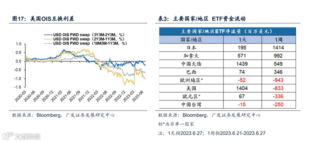 6月FOMC美联储宣布暂停一次加息,同时维持950亿美元/月缩表计划。上周以来,美债利率小幅上行,其中实际利率为主要贡献。花旗美国经济意外指数较上周上调,花旗中国&欧洲经济意外指数均较上周下调。美元流动性有所缓和,美国LIBOR-OIS利差较上周有所收窄,美国FRA-OIS利差较上周震荡持平。最近一周以来(23.6.21-23.6.27期间),ETF资金流入排名前三的国家/地区分别是日本、加拿大、中国大陆,分别流入14.14亿、9.92亿、5.49亿美元;ETF资金流出排名前三的国家/地区分别是欧洲地区、美国、欧元区,分别流出9.43亿、8.33亿、3.36亿美元。