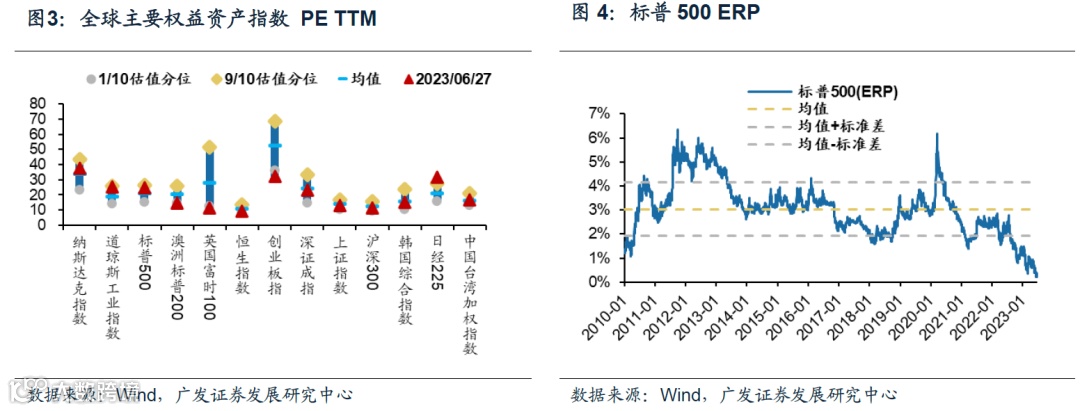 (3)全球主要权益资产估值:截至6月27日,全球主要权益资产估值(PE TTM)历史分位数最高为:日经225指数31.73倍(92.10%历史分位)、道琼斯工业指数25.57倍(89.70%历史分位)、标普500指数24.86倍(85.70%历史分位)。历史分位数最低为:创业板指32.23倍(4.30%历史分位)、英国富时100指数11.20倍(5.20%历史分位)、澳洲标普200指数14.46倍(9.80%历史分位)。