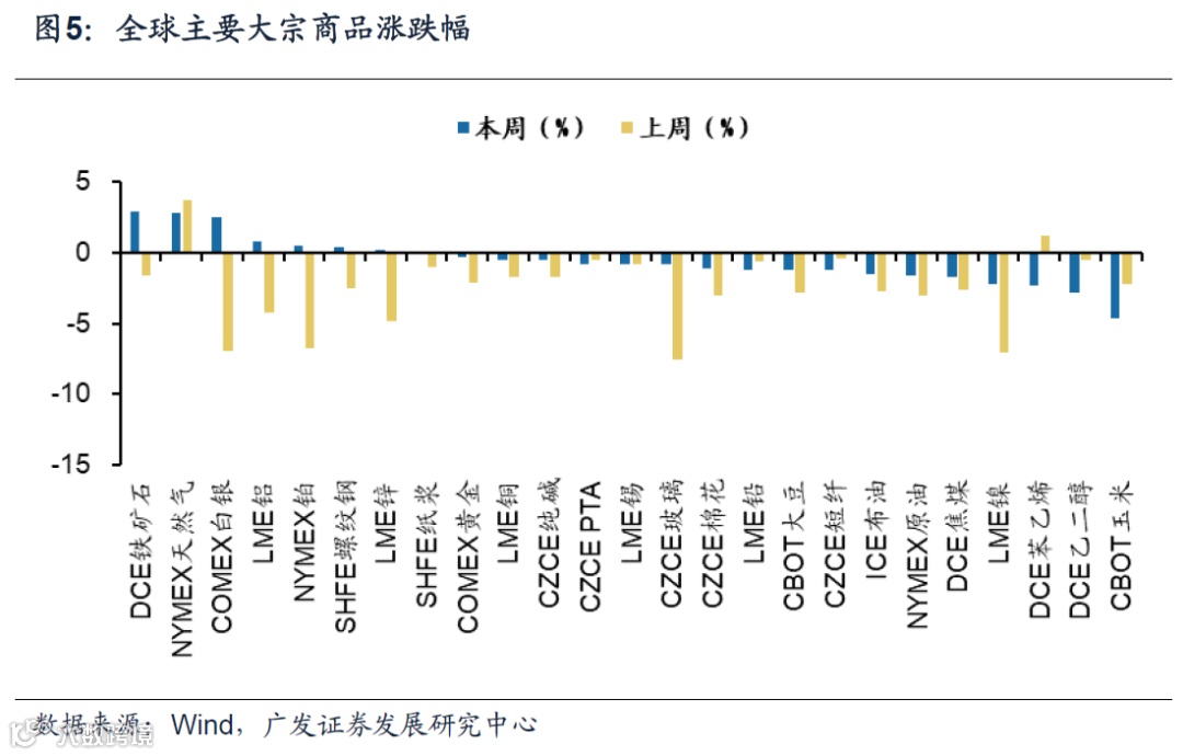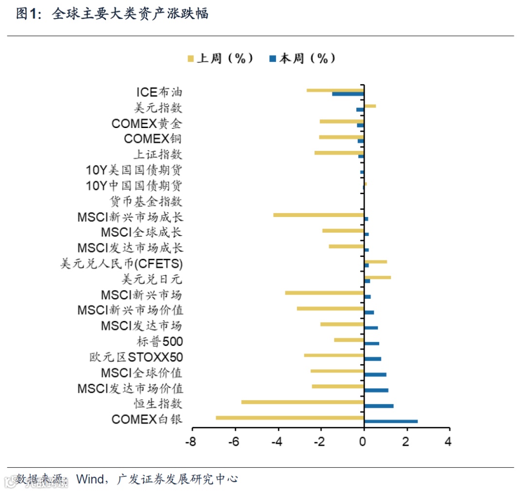 (2)上周大类资产表现:美元>债券>权益。上周美元兑日元领涨(涨1.26%),其次为美元兑人民币(CFETS)涨1.08%、美元指数涨0.55%、10Y中国国债期货涨0.14%、10Y美国国债期货涨0.03%。上周COMEX白银领跌(跌6.93%),其次为恒生指数跌5.74%、MSCI新兴市场成长跌4.24%、MSCI新兴市场跌3.70%、MSCI新兴市场价值跌3.13%。