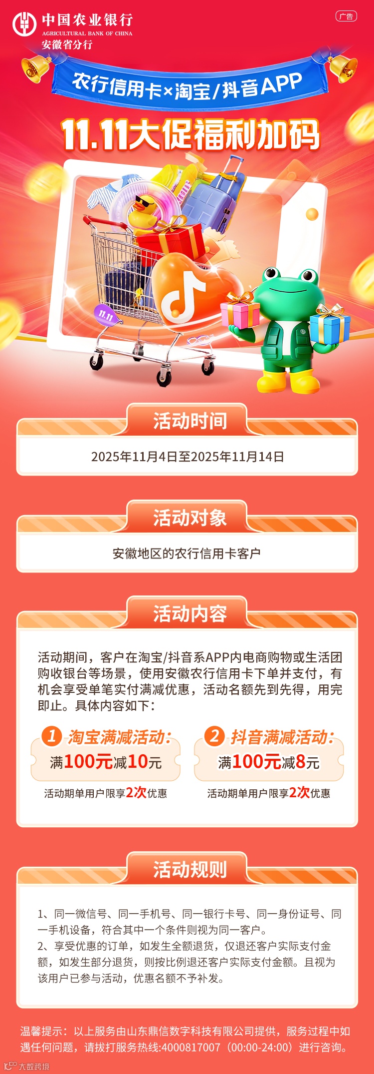 【WOW福利】淘宝抖音11.11福利加码,农行信用卡支付消费享立减!
