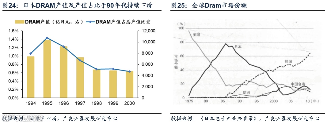 日本计算机产业链的上下游同样缺乏竞争力。上游来看,同样是由于价格劣势、未抓住新需求,日本DRAM产业亦丧失优势地位,产值持续下滑。