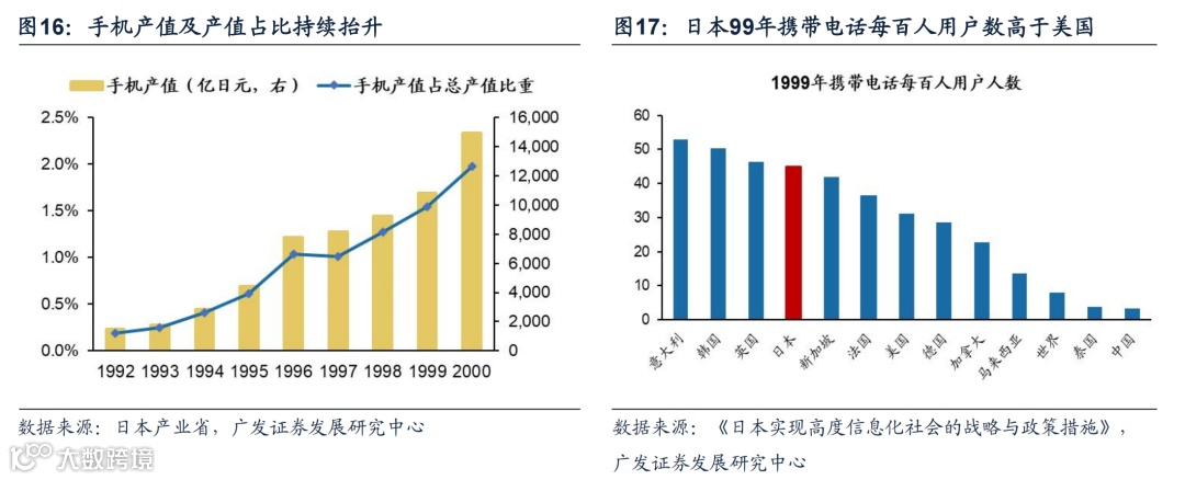 尽管国内面临资产负债表衰退,但科技周期可脱敏于宏观周期,手机作为替代固话的技术创新,日本国内90年代对于手机的需求旺盛。99年来看,日本每百人手机用户数高于美国,表明国民对手机的接受度较高。