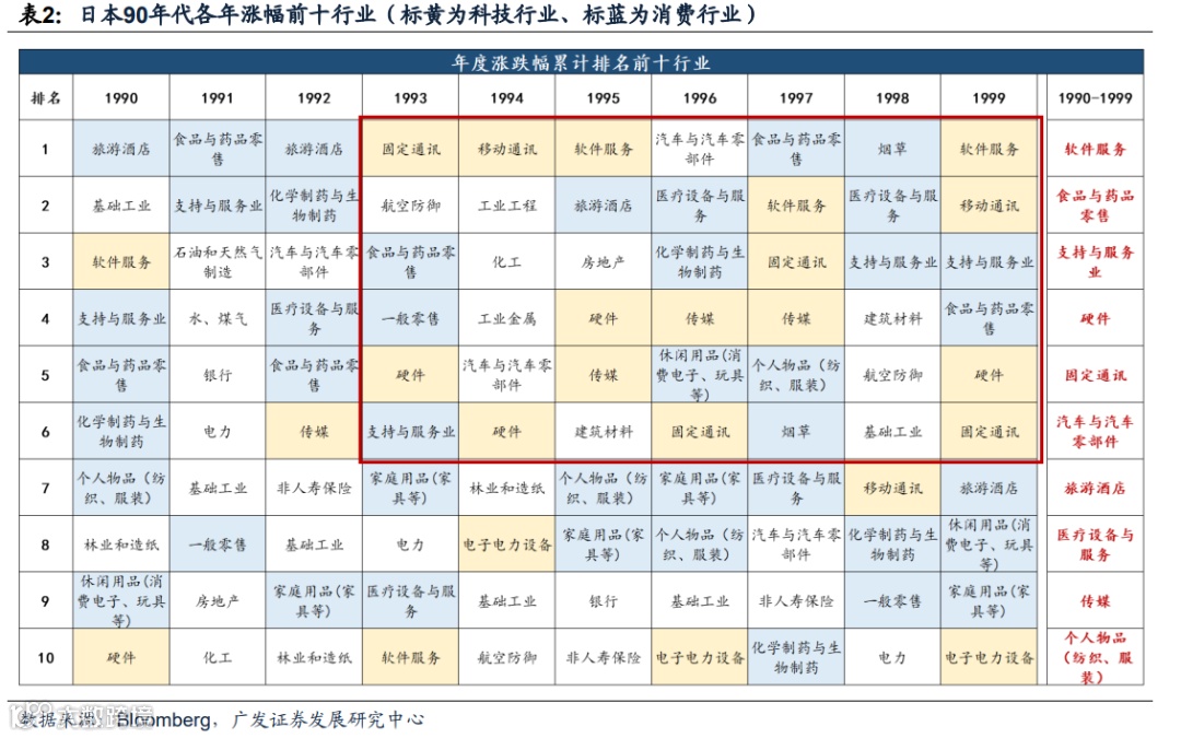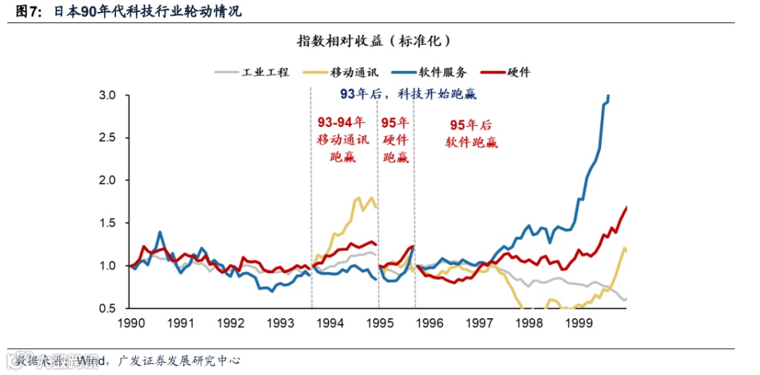 我们讲“杠铃策略”特征,其中一端是“高风险高收益”资产:追求远期盈利兑现的确定性。除了日本人口结构变化驱动的消费品之外,科技行业是日本90年代(尤其是93年之后)表现最好的行业,是对美国计算机信息技术牛市的映射。