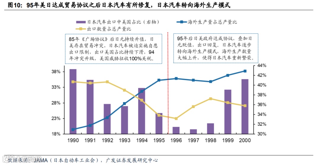 值得一提的是,汽车产业在经历回落后重新巩固了全球优势,不断增长的对外投资与海外生产是修复的秘诀。1994年,日本汽车的海外产量超过了其出口总量,在出口总量不温不火的90年代,日本汽车海外产量一路高增。采用海外生产模式一方面使日本汽车绕开了欧美的贸易限制,另一方面帮助日本在东南亚及中国等新兴市场不断开拓。增长的外需使汽车产业继续蓬勃发展,日本汽车销量维持增长。