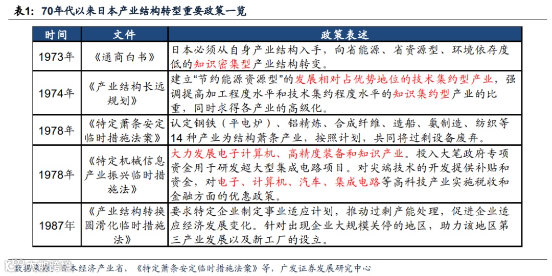 “轻薄短小”时期:以74年石油危机为转折点,节能、环保成为日本产业结构调整的重要目标,相关政策密集出台,指明日本将向技术集约型、知识密集型产业转变——“轻薄短小”。并开启钢铁、化工、等资源密集型产业的去产能进程。1978年,经济学家小岛清提出“边际扩张理论“,鼓励将失去比较优势的传统行业转移至国外,对日本产生极大影响。同年日本出台《特定机械信息产业振兴临时措施法》,对尖端技术的开发提供补贴和资金,对电子、计算机、汽车、集成电路等高科技产业实施税收和金融方面的优惠政策,并积极发展第三产业。