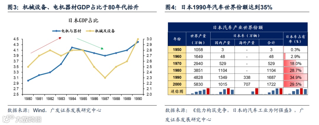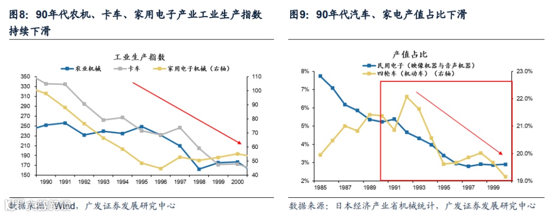 80年代日本的优势产业集中在制造业,代表行业是机械设备、家电与汽车。但在“增长中枢下滑的十年”间需求明显受到影响。