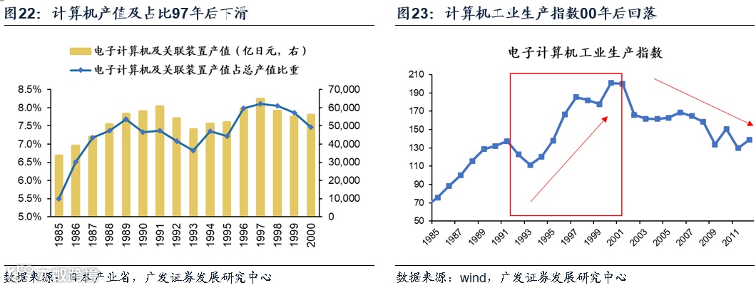 并非日本本土的优势产业驱动,而主要受80-90年代美国信息技术革命而影响。全球科技共振给日本产业带来影响,其中计算机硬件领域乘势而上而又在发展中落后,软件和互联网行业并非日本的优势领域,股票表现主要是美股映射。