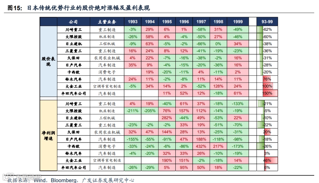 仅汽车行业龙头公司在90年代后半段重拾上涨趋势。汽车板块中的丰田、铃木等股价表现出色,股价于1997年开始大幅上涨,93到99年丰田与铃木汽车股价涨幅分别为150%与76%(丰田94年才上市),盈利复合增速维持正增长。