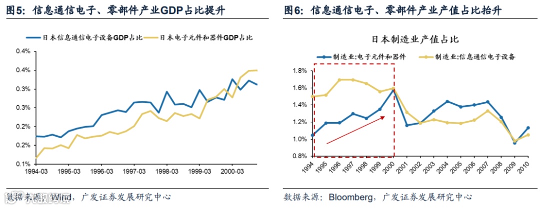 然而科技与制造业的创新周期却相对脱敏,比如小家电在家庭渗透率达到饱和后90年代需求受损、但手机的消费浪潮依然如期而至,个人计算机的发展也与全球发展浪潮紧密联系。在科技的需求周期和经济运行周期的脱敏之下,日本作为技术密集型制造业的优势国家,也打造了部分领域“由重到轻”的科技制造业升级。