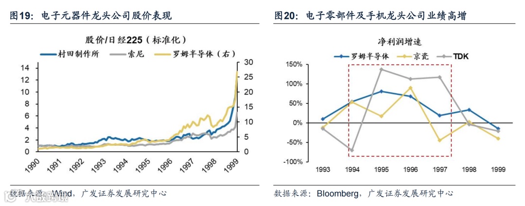 如果细究日本科技股股价背后的收入和业绩支撑,我们会发现除了1999-2000全球科网泡沫时期,在90-98年期间股价表现基本与业绩支撑吻合,例如优势产业半导体的罗姆半导体,电子零部件的TDK在90-98年股价分别上涨165%与81%,显著好于计算机行业龙头富士通与NEC的42%及-44%。