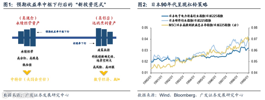 ● 新范式之“杠铃策略”,在上世纪90年代日本演绎充分。我们在6.3中期策略展望《新投资范式:拥抱确定性!》,对新范式做出全面阐述。“新范式”意味着全球追逐确定性溢价,资产价格表现呈“杠铃策略”——两端资产占优(AI &中特估高股息),在系列二《新投资范式:成因、日本启示与应对》中我们详细展开90年代日本也面临两大不确定性,“杠铃策略”同样在90年代日本资产价格中体现,本篇报告我们主要聚焦90年代杠铃策略一端,日本科技股表现。