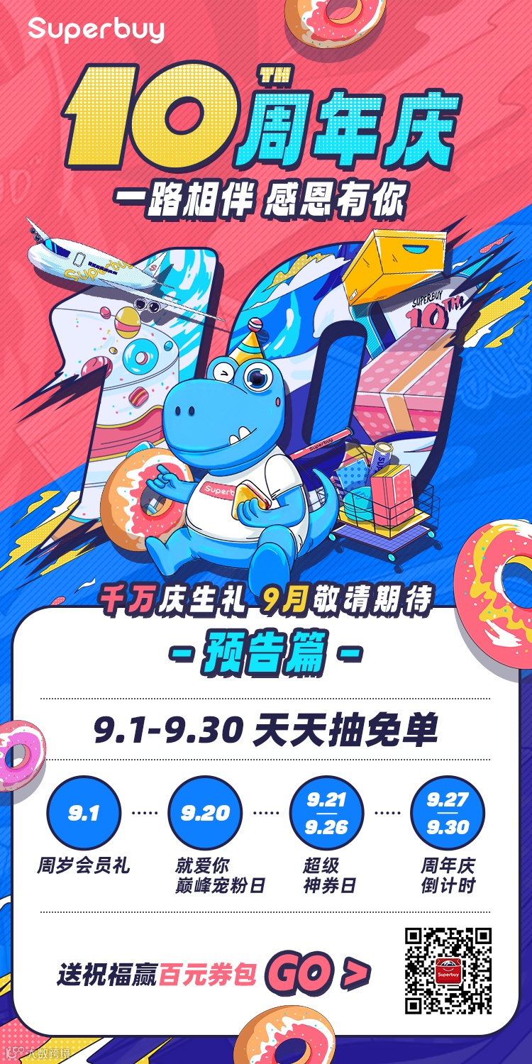陪伴是最长情的告白,10年之光,感恩一路同行,不离不弃。Superbuy 10周年庆感恩好礼,9月倾情回馈,千万庆生礼大发送,足足1个月!周年庆羊毛必薅,快来瞧瞧吧!小编为您送上周年庆的预告攻略,一一为您揭晓!