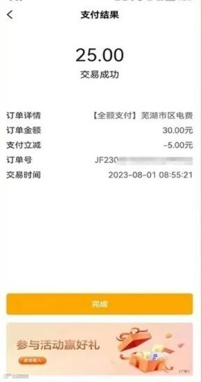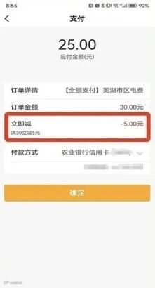 活动期间,客户登录农行掌银APP,定位安徽省,进入【生活缴费】栏目缴纳电费,可享受1次“满30元立减5元”优惠。每名客户每月限享1次优惠,活动名额有限,先到先得,用完即止。