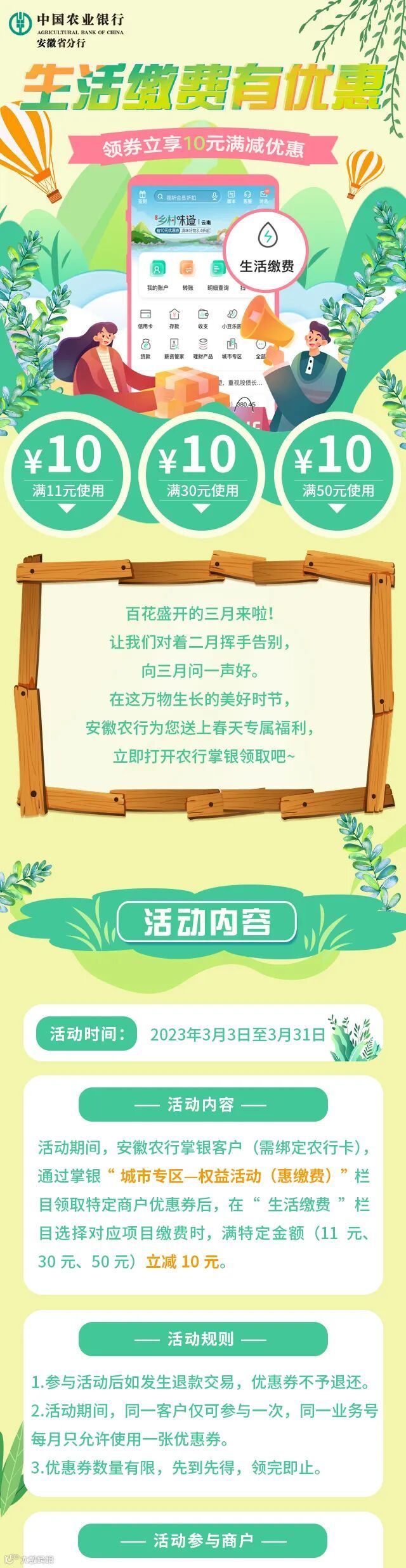 农行喊您来领券啦,生活缴费立减10元!