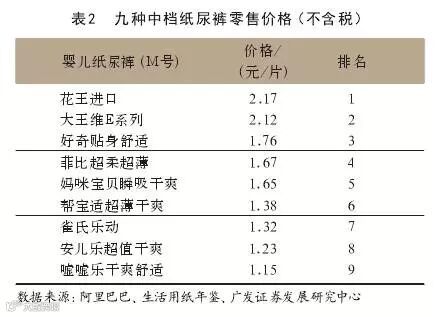 海淘新税率,跨境电商新挑战。2016年4月6日,国家对跨境电商实行新税制。按照新税制的影响,我们将海淘产品分为两类:(1)消费者在跨境电商购买的海外产品;(2)代购或者直邮的海外产品。对于第一类产品,在新税制下不再享受行邮税的免税额度,并且征收11.9%的消费税。对于小于500元的母婴产品,在新税制下将多缴纳11.9%。对于大于500元的母婴产品,只增加了1.9%。对于第二类产品,税改后仍按照税改前征税,只是由原来三档税目调整为四档,母婴产品税率由原来的20%增至30%。在新税制下,海淘成本将会增加不少,这也给国内纸尿裤厂家提供了发展的机会。据跟踪调查,九种中档纸尿裤零售价格如表2。