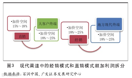 现代渠道是纸尿裤销售的主要方式,占据市场总销售额半壁江山。主要有直销和经销两种方式。直销在现代渠道中的占比相对较小,主要集中在一、二线城市,进行销售的纸尿裤整体加价空间大约为33%~43%。经销方式占了很大比重,其毛利空间根据产品的实际情况控制在18%~25%之间,因此通过现代渠道进行销售的一次性纸尿裤,从出厂价到终端零售价的顺加利润在36%~50%之间(图3)。
