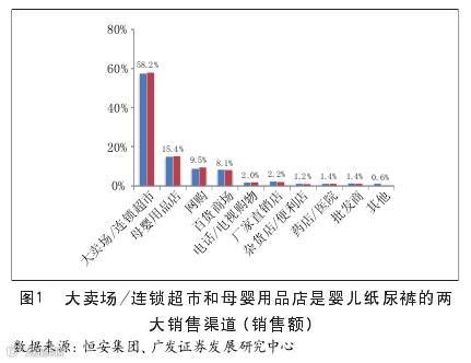 不同渠道坐拥各自优势,助力纸尿裤市场发展。婴儿纸尿裤属于快速消费品,同时由于其卫生护理用品的属性,销售渠道除了普通的传统渠道和现代渠道之外,还有一种特殊的销售途径——母婴渠道(母婴用品专营店)。纸尿裤产品在一线城市的销售主要通过现代渠道,大卖场、连锁超市的覆盖范围广,同时产品种类多元化、价格合理,深受消费者的喜爱;而在二、三线城市,传统渠道则负责覆盖现代渠道无法辐射到的区域,实现立体化销售;母婴渠道作为纸尿裤产品的独特销售途径,凭借其专业化、品牌化的优势,近年来在国内发展迅速;随着互联网以及网购的流行,电商渠道凭借其便利性,逐渐成为纸尿裤销售的又一渠道(图1)。
