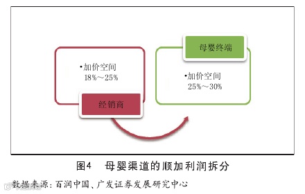 母婴渠道优势明显,深受消费者青睐。凭借着一站式服务、专业化和综合性的优势,母婴渠道获得了越来越多年轻父母的青睐。恒安集团的市场调研结果显示,目前母婴渠道的销售增长稳定,已经成为仅次于大卖场/超市的第二大渠道,母婴渠道的加价率略高于大卖场和连锁超市,通过母婴渠道进行销售的纸尿裤从出厂价到终端零售价的顺加利润在43%~55%之间(图4)。