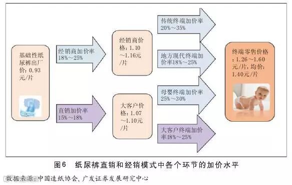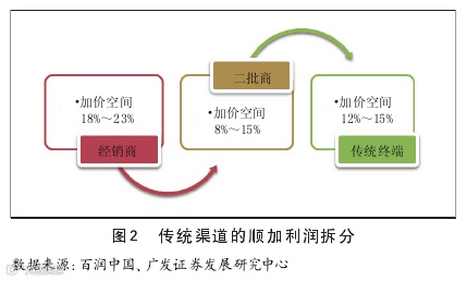 纸尿裤传统渠道尚未消失,仍有生存空间。对于传统渠道,纸尿裤厂商一般会通过设立区域性的办事处进行统一批货,经过一级、二级经销商层层分销,最后通过小超市、杂货店等终端网点销售给消费者。因此其间的加价环节主要包括经销商、二批商和终端销售三个方面,根据百润中国提供的数据以及我们实地走访的情况,传统渠道各个环节的顺加利润合计在38%~53%之间(图2)。