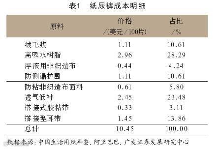 原材料价格决定纸尿裤成本,用料决定品质。纸尿裤的原料来源主要是石油化工产品和绒毛浆,其中绒毛浆和高吸水树脂SAP是最关键的原材料,其占比的多少,不仅直接影响纸尿裤的吸收、回渗等功能的发挥,还与产品的成本紧密相关。为了更加细致地分析纸尿裤的成本构成,我们以纸尿裤市场中占比最大的婴儿纸尿裤产品进行成本明细拆分,如表1(以下数据均为不含税价格)。