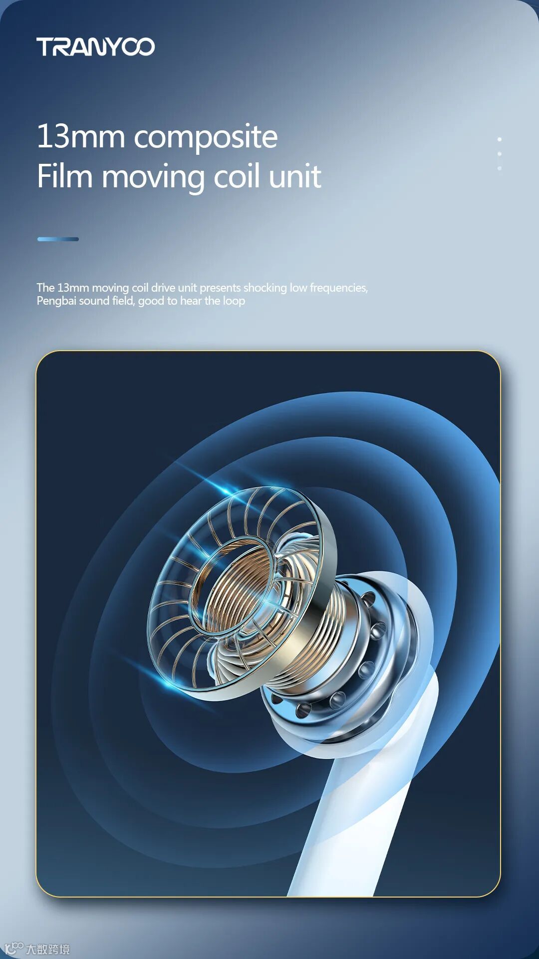 3. 13mm composite membrane moving coil unit speaker, full in mid frequency, clean in low frequency, no noise in high frequency.