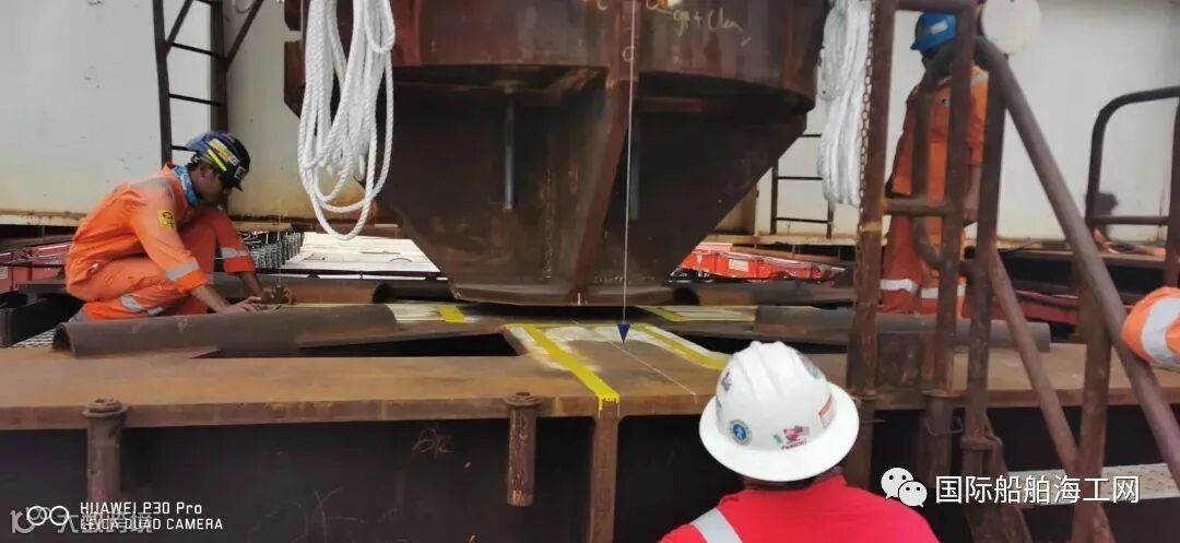 12月16日,装货作业正式开始。2组SPMT同时作业,两组平板车将货提前运至船边。0600时,船员将船舶调整到位后,货方准备跳板及做装货前准备;0730时,第一件货物开始上跳板,上午按计划圆满完成2件货物装载任务。两组平板车相继离开后,随即组织、准备下午的装载作业;下午的作业同样安全高效,1915时,第五件货物顺利装船!