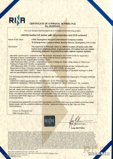 2022年10月,广船国际海科院自主研发设计的LRⅡ油船LNG+氢燃料双燃料项目获得RINA船级社原则性认可证书(AIP),标志着广船国际海科院已经实现了氢燃料船舶领域的技术储备,成功掌握了新能源动力船设计等前沿尖端技术。